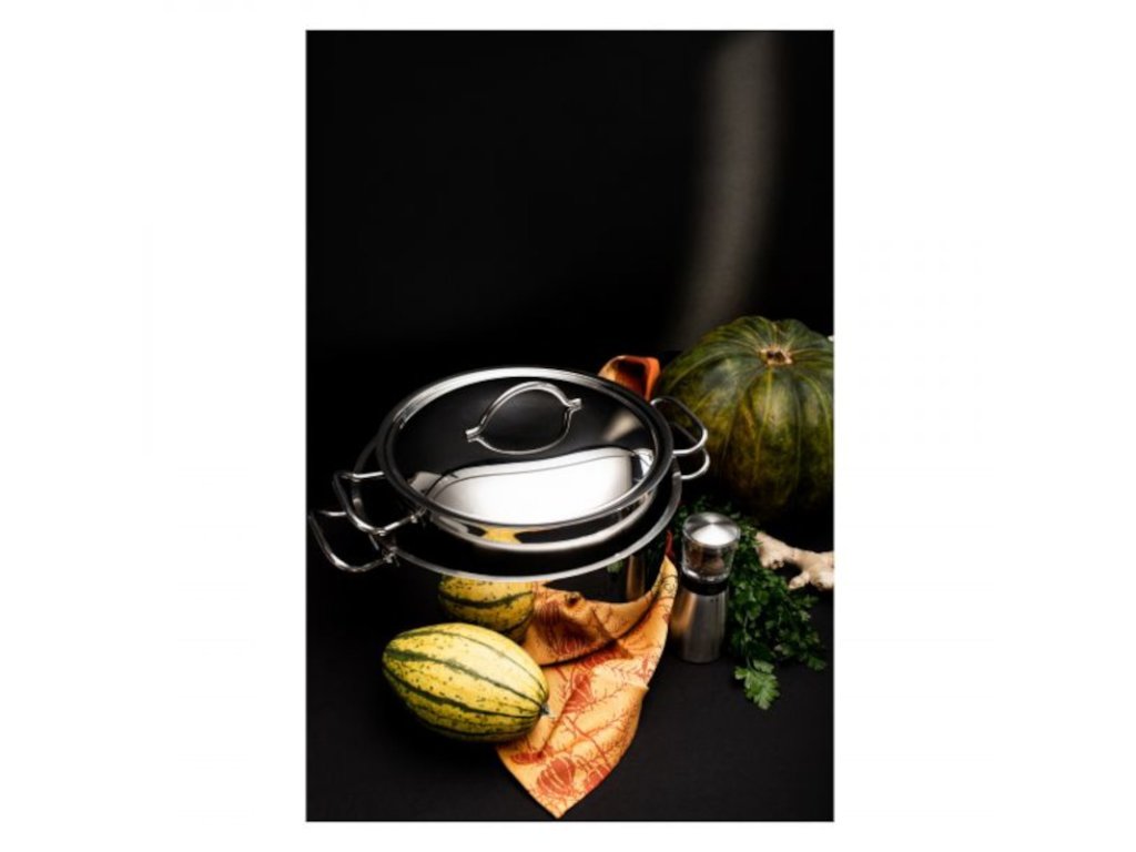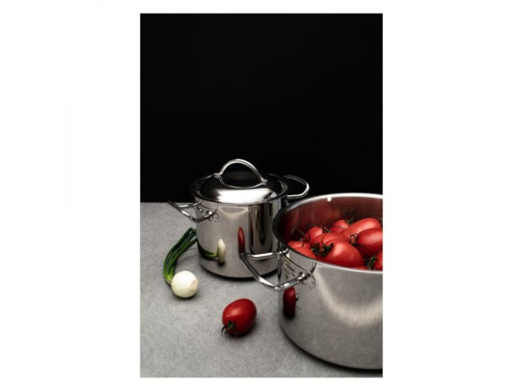 Nerezový hrnec vyrobený z jednoho kusu oceli o síle 1–1,2mm s leštěným, zesíleným okrajem o síle 1,32 mm se stane vaším věrným parťákem a pomocníkem v kuchyni. Chlubí se svými bodovanými izolovanými rukojeťmi, které usnadňují manipulaci během vaření i servírování. Dále vlastní sendvičové 3vrstvé dno o síle 7 mm (nerez-hliník-nerez). Hrnec se hodí na všechny typy sporáků včetně těch indukčních.Hrnec vysoký 5 l, pr. 20 cm