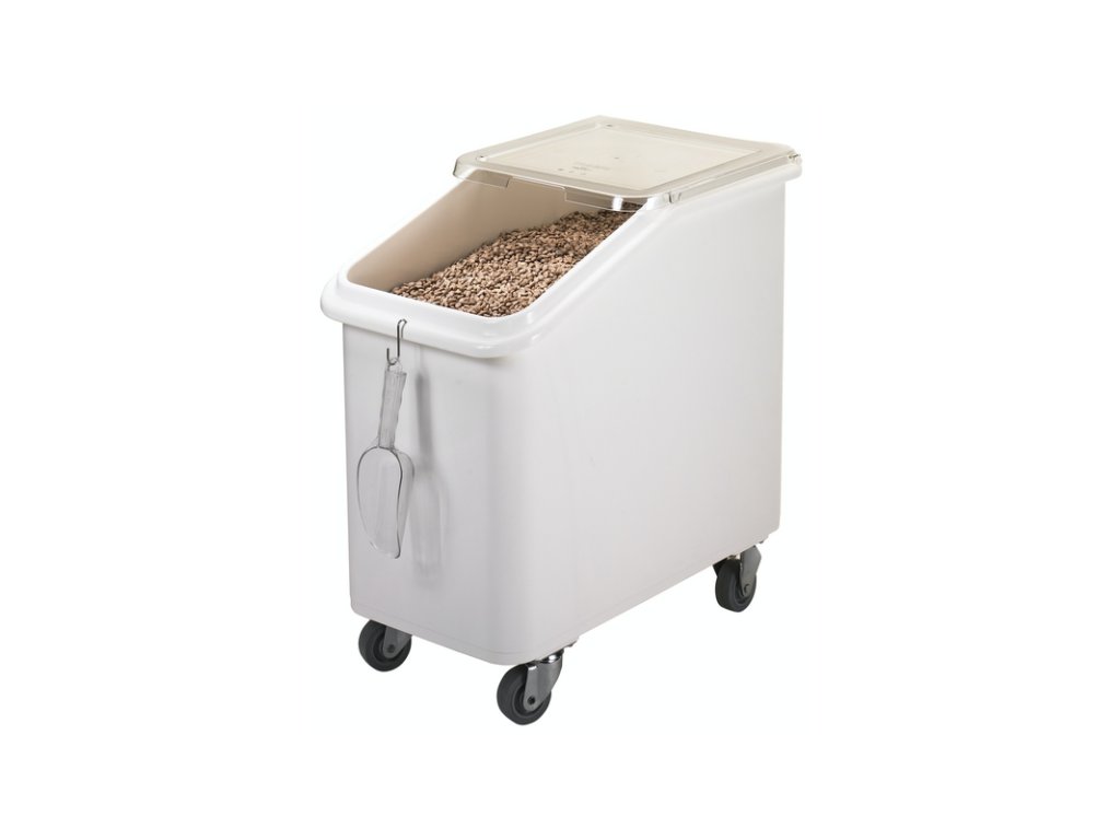 Tento vozík se ideálně hodí pro skladování suchých, sypkých surovin, jako je mouka, cukr a jiné produkty. Je navržený pro jednoduché použití – posuvné, průhledné víko umožňuje snadnou a rychlou manipulaci i identifikaci obsahu. Kromě toho splňuje hygienické podmínky a bezpečnost pro styk s potravinami. Díky materiálu schváleného FDA se nemusí vkládat další sáčky na odpad. Svým tvarem a proporcemi se vejde pod standardní pracovní stoly. Svou odolností a všestranností představují vhodnou volbu v jakémkoli stylu restaurace.Vozík na potraviny 102 l, 42 × 75 × 71 cm
