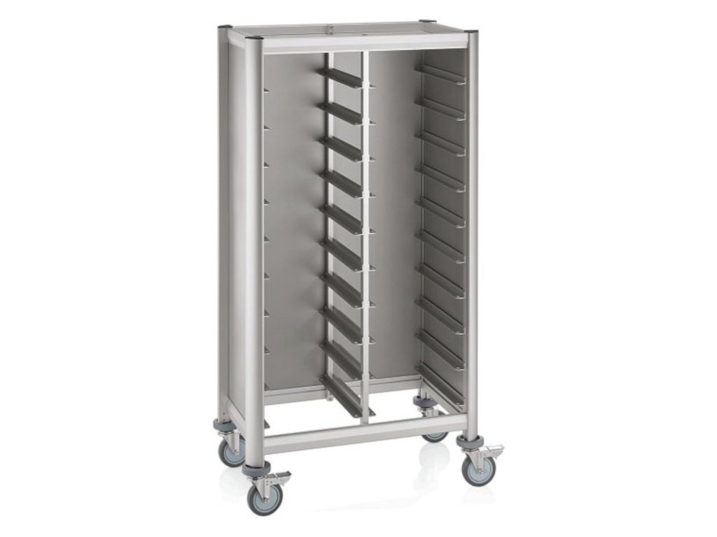 Tento vozík se skvěle hodí pro převážení rovnou 20 táců. Disponuje 4 otočnými kolečky o průměru 12 cm, z toho 2 s brzdou. Vyrábí se z odolného hliníku, který zaručuje vysokou odolnost a dlouhou životnost.Vozík na tácy 86 × 51 × 165 cm, 2× 10 pozic