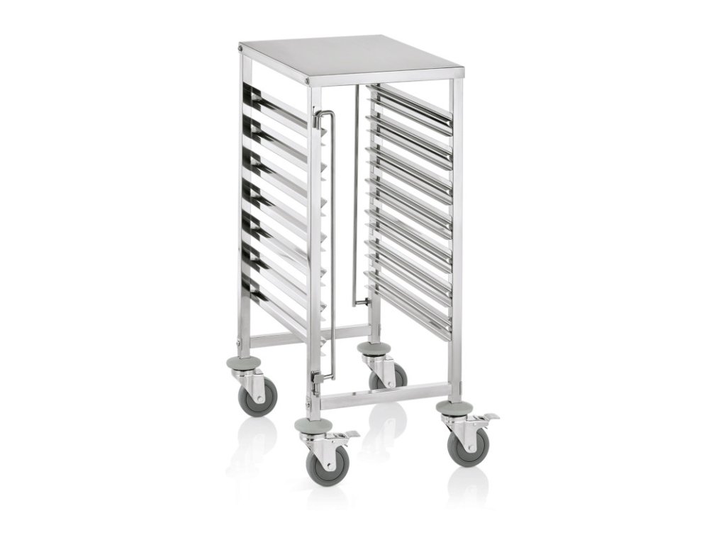 Tento regálový vozík se skvěle hodí pro převážení nádob a zásobníků GN 1/1. Pojme až až 7 nádob nebo 14 zásobníků. Má 4 otočná kolečka o průměru 12 cm s nárazníky, z toho 2 s brzdou a bezpečnostní pojistkou proti převrácení (zabraňují tak převrhnutí převážených nádob). Ušlechtilá ocel zaručuje nejen vysokou odolnost vůči mechanickým a chemickým vlivům, ale také si po dlouhou dobu uchovává i svůj lesklý vzhled. Díky vysoké kvalitě zpracování se vozík vyznačuje dlouhou životností a vysokou zatížitelností.Vozík regálový 55 × 38 × 95 cm