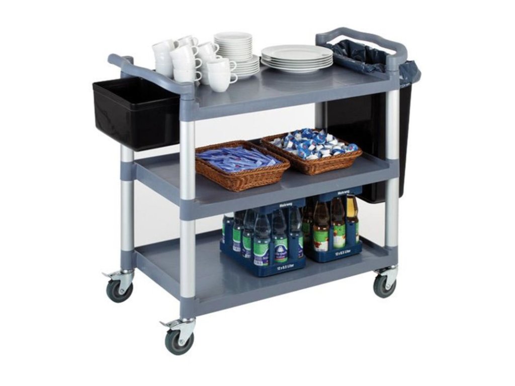 Servírovací a přepravní vozík v šedé barvě vyrobený z polypropylenu s hliníkovým rámem. Disponuje 3 policemi a 4 otočnými kolečky s brzdami. Snadno se montuje a dodává se bez nádob.Vozík servírovací 108 × 50 × 96 cm