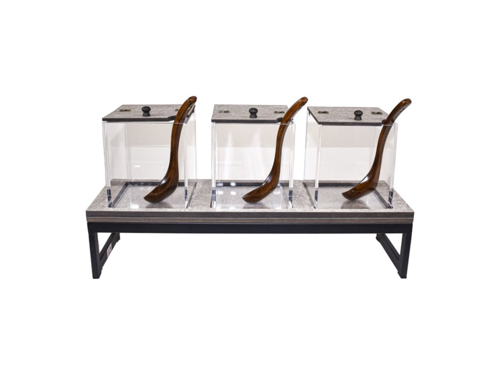 Zásobník na cereálie se stojanem s müsli, ořechy nebo sušené ovoce je nepostradatelným doplňkem pro vaše snídaňové bufety, kavárny či hotelové restaurace. Obsahuje průhledné nádoby a umožňuje vašemu personálu snadnou kontrolu množství surovin nebo přehledný výběr pro hosty. Set obsahuje základnu pro zásobník, 3 lžíce, 3 dózy s víkem ve stejné barvě základny. Barvu stojanu si lze vybrat podle vašich preferencí.Set obsahuje